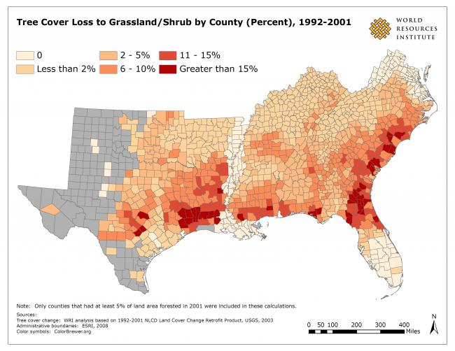 Figure 4. Forestry was responsible for the greatest amount of change in forests. Many counties with the greatest loss of forests to grassland/shrub (recently cleared or newly regenerating forests) also had the greatest amount of forest gain. Most of this change took place in rural areas of the South.
