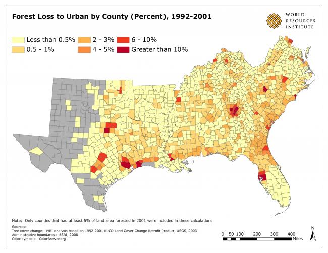 Figure 2. Urbanization is a leading cause of deforestation—the permanent loss of forests to another land use—in the South. Counties with the greatest loss of forest due to urbanization were in the fringe of rapidly growing metropolitan areas, including Atlanta, Georgia; Raleigh, Charlotte, and Greensboro, North Carolina; Houston, Dallas, Austin, and San Antonio, Texas; Tampa and Jacksonville, Florida; Louisville, Kentucky; and the northern Virginia suburbs of Washington, DC.The US Forest Service estimates that suburban encroachment will impact approximately 12 million acres of southern forests between 1992 and 2020 and an additional 19 million acres between 2020 and 2040, for a total of 31 million acres. This Forest Service forecast was based on an assessment of land use, predicting extensive conversion of forests to developed land use, as well as fragmentation of forests by development, in coming years. Because these suburban and urban areas will still retain many small areas of forest cover, this forecast estimates a larger area of forests affected than the MRLC/USGS remote sensing data, which measures exact changes in forest cover rather than changes in dominant land use.