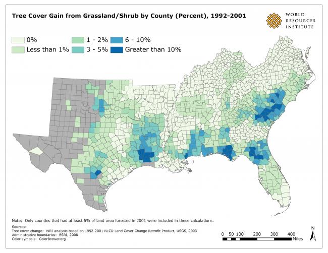 Figure 4. Forestry was responsible for the greatest amount of change in forests. Many counties with the greatest loss of forests to grassland/shrub (recently cleared or newly regenerating forests) also had the greatest amount of forest gain. Most of this change took place in rural areas of the South.