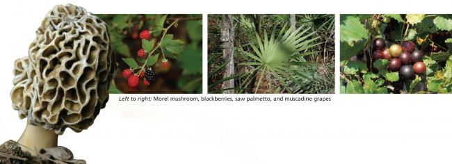 - 20 species of edible plants such as blackberries, muscadine grapes, and wild onions, as well as edible fungi such as morel and wood ear mushrooms;