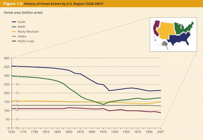 Southern forests are forests of continual change. Prior to European settlement, these forests were shaped by natural disturbances such as climatic warming after the last ice age, hurricanes, and natural fires, as well as by fires set by Native Americans. At the dawn of European settlement in the region in the early 1600s, southern forests covered an estimated 350 million acres or more. Over the next four centuries, greater than 99 percent of this acreage was cut at one time or another for agriculture, timber, or settlements.1 A testament to the renewability and resiliency of forests, much of the land regenerated over time as secondary forest. Nonetheless, approximately 40 percent of the pre-European settlement forest acreage has been converted to other uses. Only the northern forests—from Maine to Minnesota—have experienced a comparable decline in forest cover in the United States over this time period (Figure 1.5).