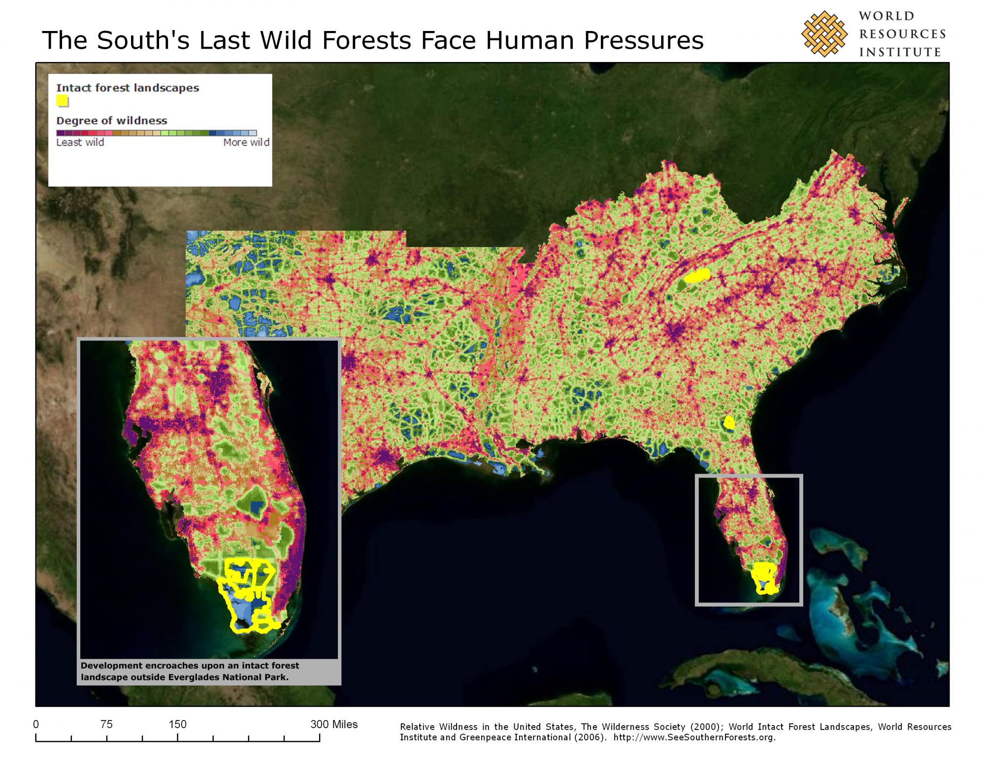 In order to measure and help preserve these areas, the World Resources Institute, Greenpeace and World Intact Forest Landscapes created the Intact Forest Landscapes dataset. This dataset serves as the first global assessment of large undeveloped forest areas based on high spatial resolution satellite imagery. The data uncover that there are only three intact forest landscapes left in the southern U.S., representing less than 1% of total land area in the region. These landscapes include portions of the Great Smoky Mountains National Park; the Okefenokee Swamp; and the forests and wetlands of southwestern Florida, comprised of Big Cypress National Preserve and portions of Everglades National Park.