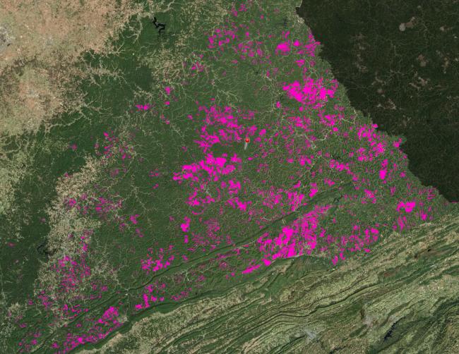 Image from SeeSouthernForests.org showing forest loss (in pink) due to mountaintop removal in Eastern Kentucky. View map here (Select “Show Additional Map Data”)